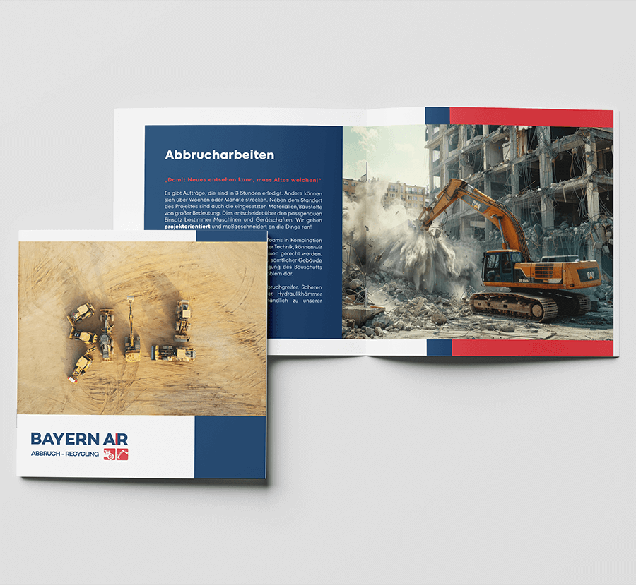 În construcții, seriozitatea se vede în detalii. Pentru BayernAR, companie de construcții din Germania, am realizat logo, cărți de vizită și o broșură care prezintă utilajele de închiriat și serviciile companiei. Materiale gândite pentru claritate și consistență, astfel încât brandul să inspire încredere și să susțină discuțiile comerciale fără efort suplimentar.